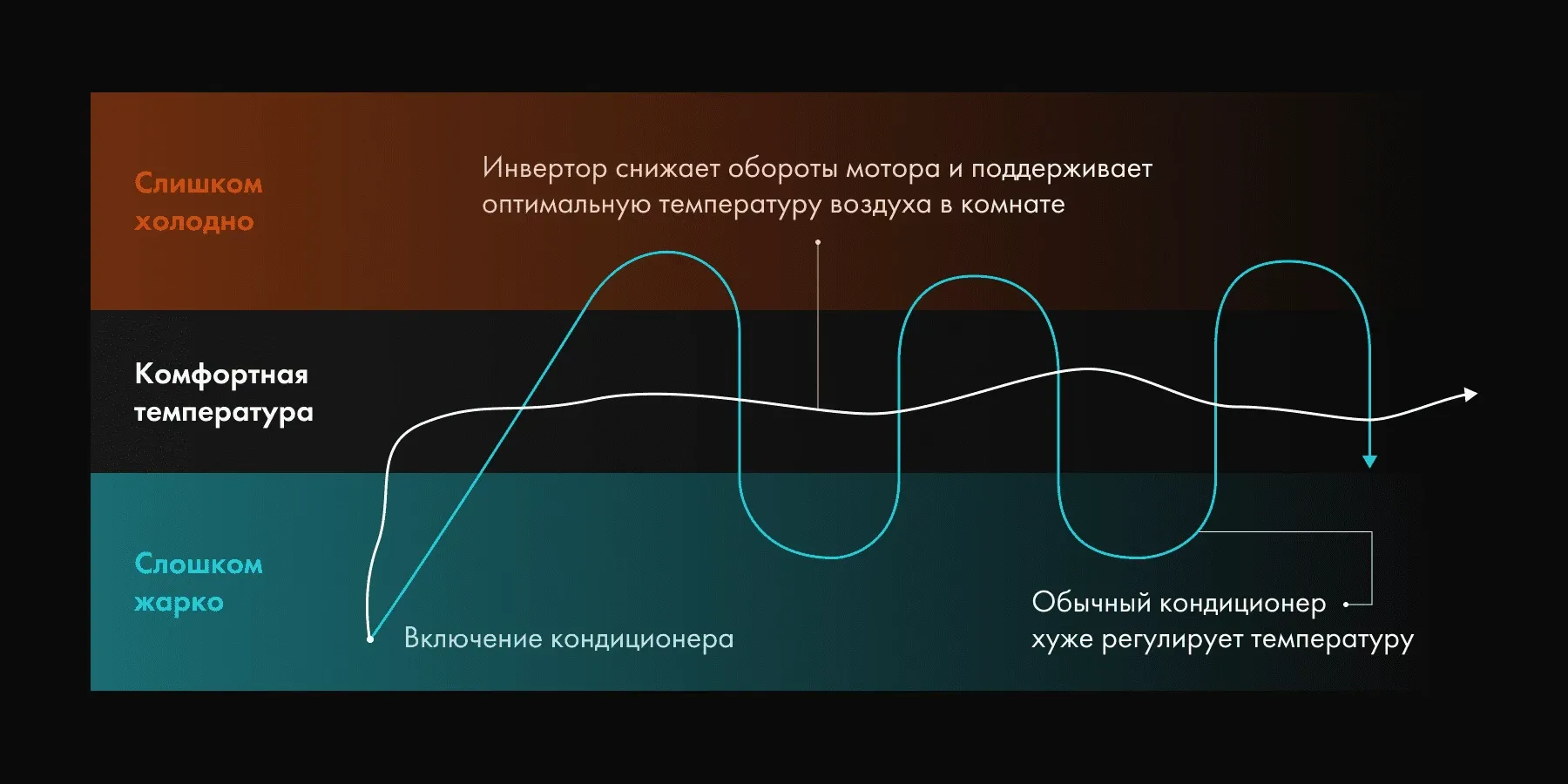Инверторные кондиционеры регулируют скорость работы компрессора. После того как кондиционер отрегулирует необходимую температуру в помещении, он не отключается, а снижает обороты компрессора до минимума и плавно обеспечивает заданную температуру без каких-либо скачков, что снижает энергопотребление, а также способствует увеличению долговечности компрессора кондиционера.